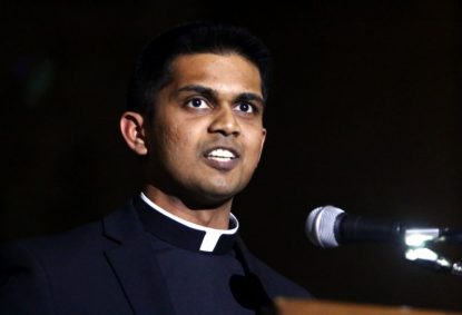 For four years seminarian Sheron Fernando served at St. Monica Parish away from his Sri Lanka home, forging a bond of family with parishioners now worried for him.