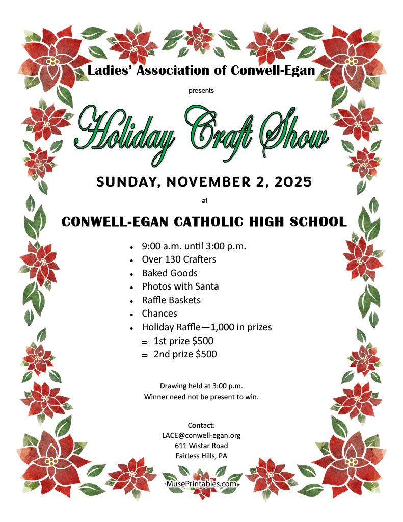 Conwell-Egan Catholic High School in Fairless Hills will host its annual Fall Holiday Craft Show on Sunday, Nov. 2, from 9:00 a.m. – 3:00 p.m.