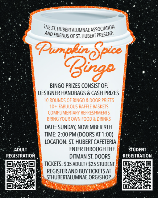 The St. Hubert Alumnae Association and Friends of St. Hubert invite the community to a festive afternoon of Pumpkin Spice Bingo on Nov. 9. Held in the St. Hubert High School cafeteria (enter through the Ditman Street doors), the event kicks off at 2:00 p.m., with doors opening at 1:00 p.m.