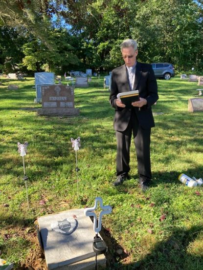 Permanent Deacon Paul Quinn blesses the burial site at St. Francis de Sales Cemetery during the interment of the cremated remains of 28 babies who died in miscarriage. The Angel Ministry, founded by funeral director Trish Marchesani, ensures these infants are laid to rest with dignity, giving families a place to grieve and pray. (Photo: St. Francis de Sales Parish)