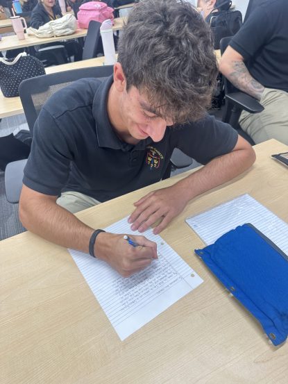 Senior Nick Morici writes a letter to a deployed service member during a student-led outreach effort at Neumann Goretti High School, inspired by his earlier confirmation service project and family ties to military service. (Photo: SS. John Neumann and Maria Goretti High School)