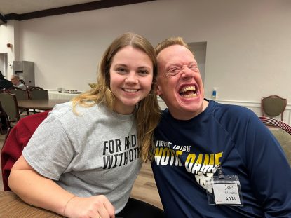 Volunteer Erin Mars shares a joyful moment with retreatant Joe McLaughlin during the 60th annual Our Lady of Confidence Retreat at Malvern Retreat Center. (Photo: Jay Sorgi)