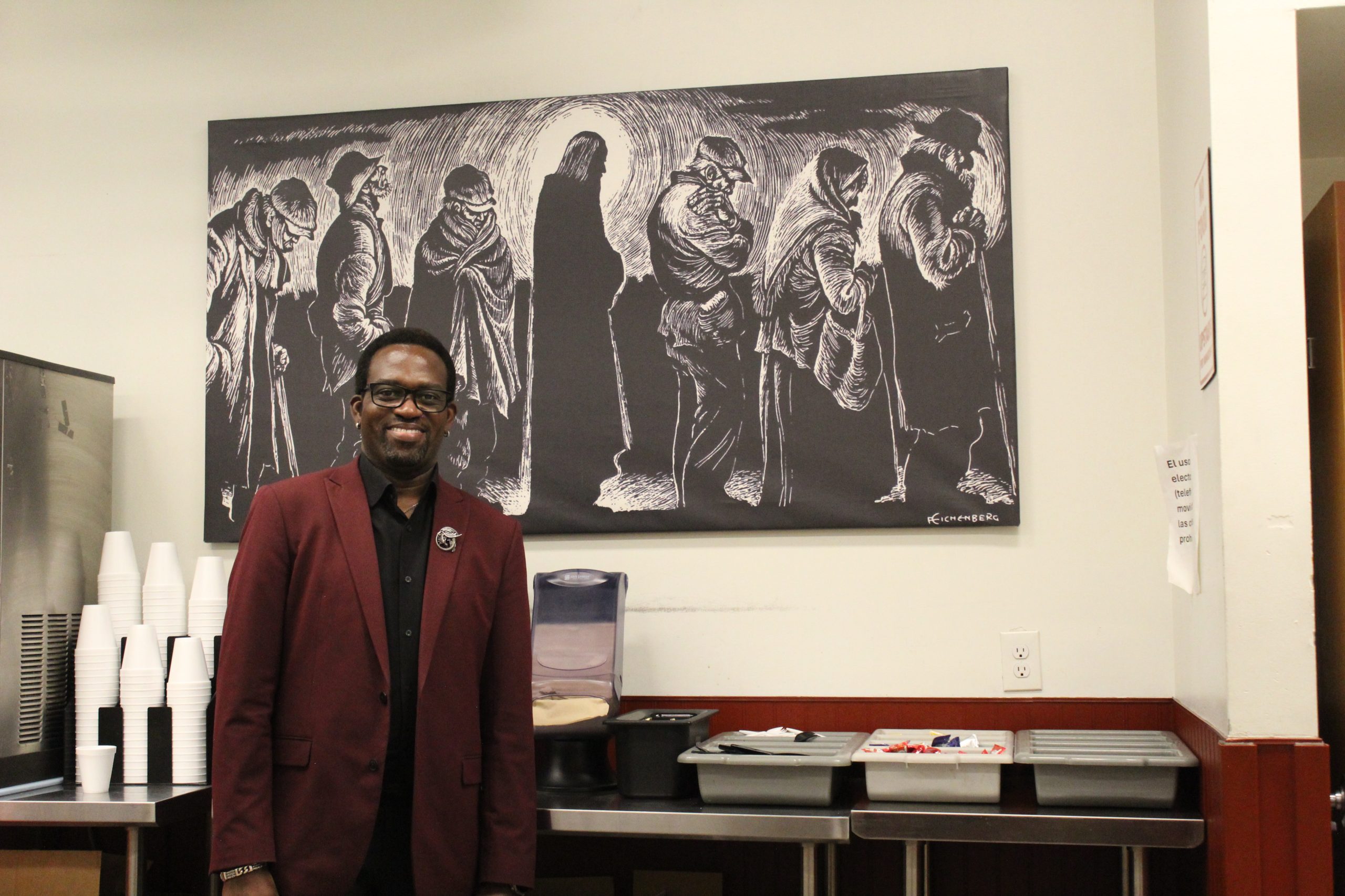 Peter Greenland beside the “Jesus and the Bread Line” poster at St. John’s Hospice.