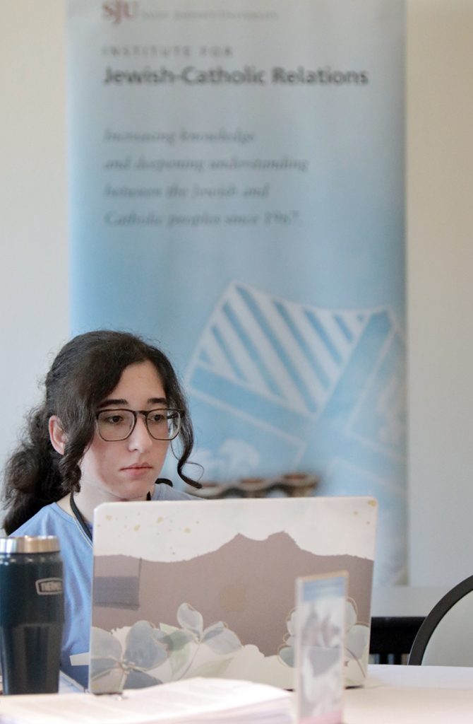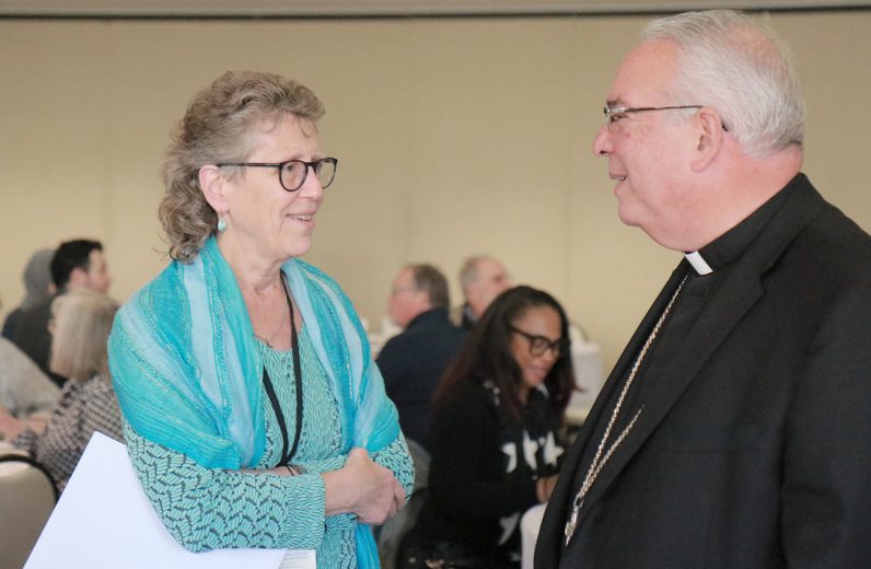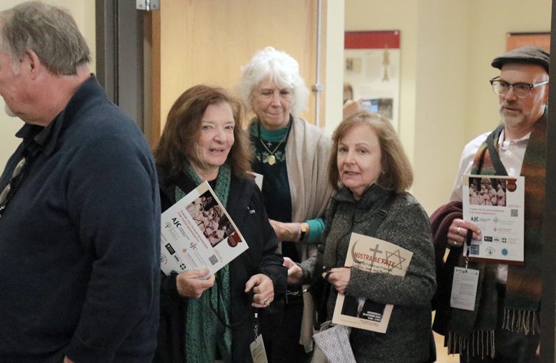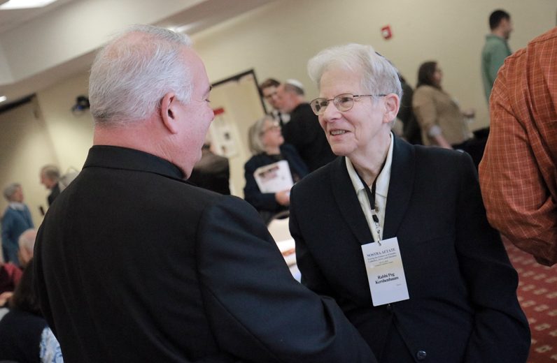 Two attendees share a moment of conversation in front of the Saint Joseph’s University Institute for Jewish-Catholic Relations sign during the Oct. 22 interfaith conference marking 60 years of Nostra Aetate, a Vatican document that reshaped dialogue and friendship among faith communities. (Photo: Sarah Webb)