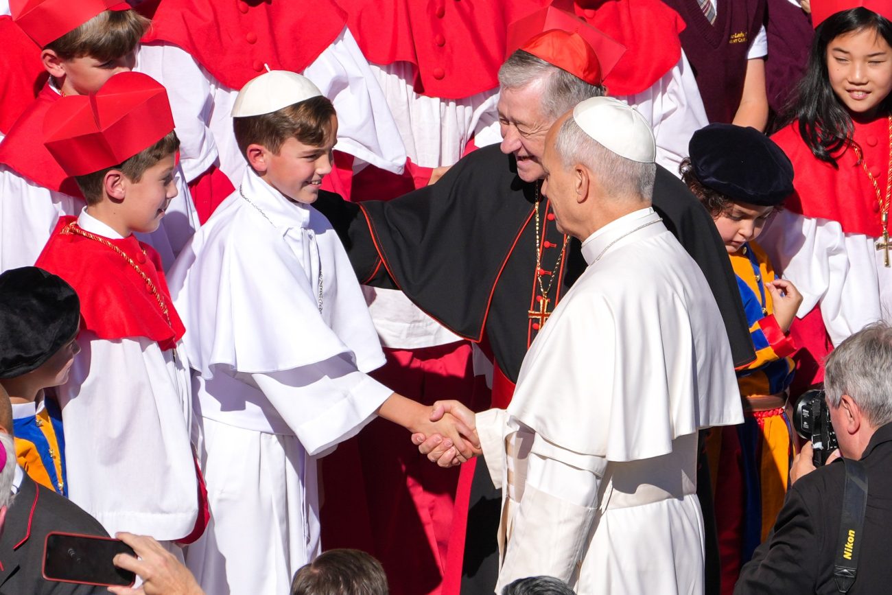 Among the more than 60,000 pilgrims in the square was a group of students from Our Lady of Mount Carmel Academy in Chicago with Cardinal Blase J. Cupich. The students were wearing white and scarlet outfits and a four-cornered hat similar to what a cardinal wears. One student was dressed as a Swiss guard.