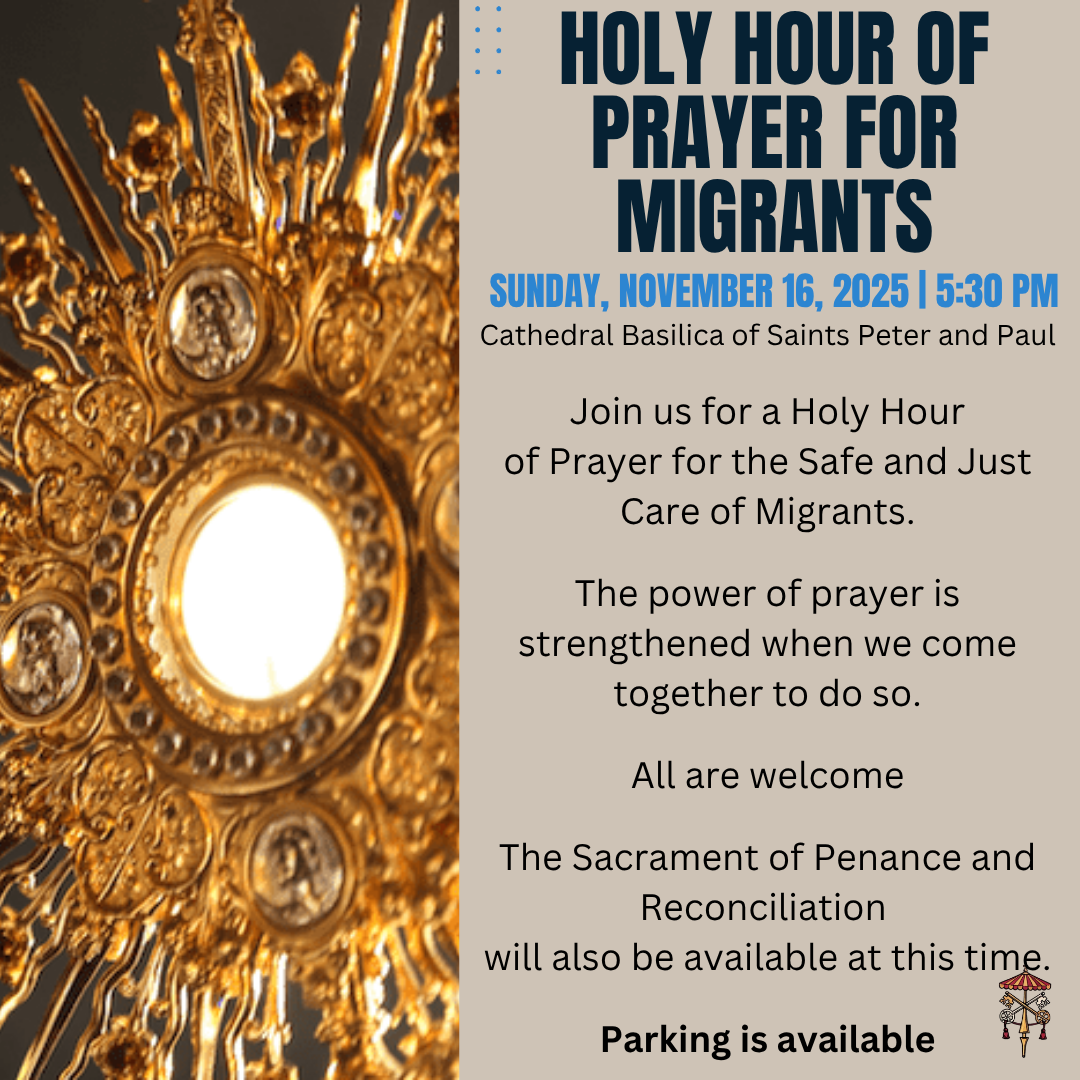 All faithful are invited to gather at the Cathedral Basilica of Saints Peter and Paul in Philadelphia for a Holy Hour of prayer at 5:30 p.m. on Sunday, Nov. 16 dedicated to the safe and just care of migrants.