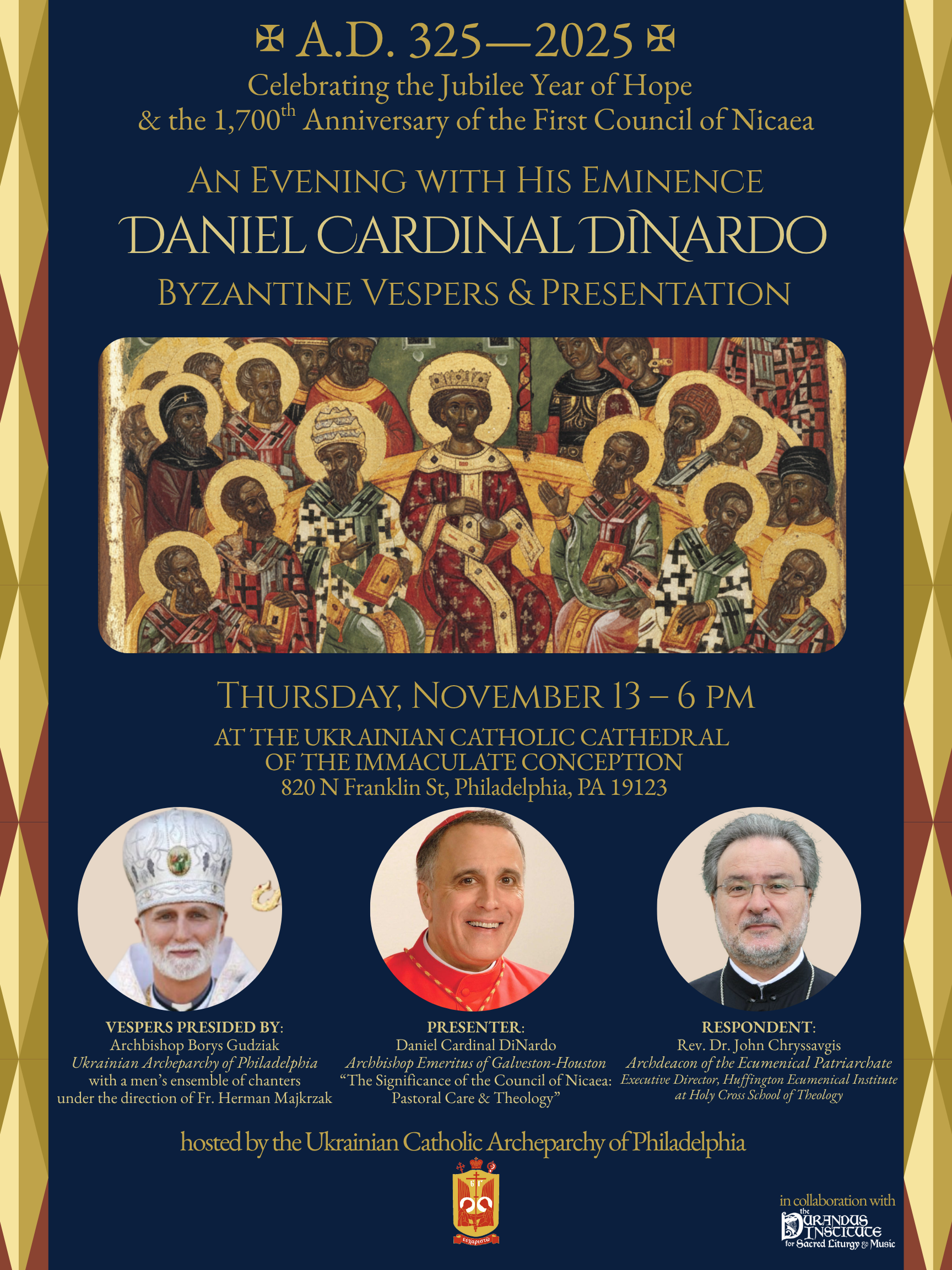 The Ukrainian Catholic Cathedral of the Immaculate Conception in Philadelphia will welcome His Eminence Cardinal Daniel DiNardo, Archbishop Emeritus of Galveston–Houston, for a special evening on Thursday, Nov. 13. Hosted by the Ukrainian Catholic Archeparchy of Philadelphia in collaboration with the Durandus Institute for Sacred Liturgy & Music, the evening aims to encourage ecumenical reflection on the Nicene Creed’s meaning for today’s Church.