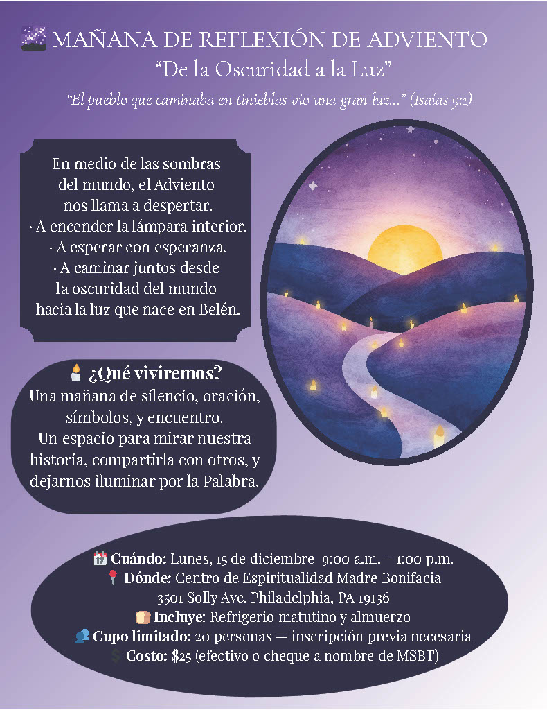 El domingo 15 de diciembre, el Centro de Espiritualidad Madre Bonifacia será sede de la Mañana de Reflexión de Adviento en Español “De la Oscuridad a la Luz”, de 9:00 a.m. a 1:00 p.m. La jornada, dirigida por la Hna. María Rincón, MSBT, invita a vivir una mañana contemplativa de silencio, oración y reflexión compartida en español. Caminaremos desde las sombras del mundo hacia la luz de Belén, guiados por la Escritura y la comunidad. El programa incluye refrigerio matutino y almuerzo. El costo es de $25, con cupo limitado a 20 participantes.