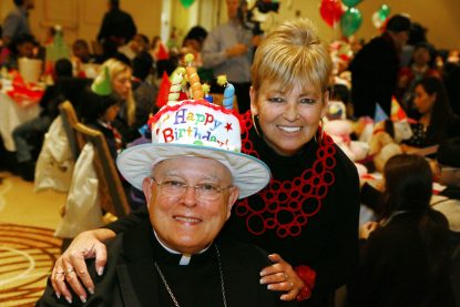 Archbishop Charles J. Chaput, O.F.M., Cap., wears a festive hat alongside longtime organizer Amy Stoner at the 2019 Archbishop’s Christmas Party in Philadelphia. That year’s theme was “Happy Birthday, Baby Jesus!” (Photo: Sarah Webb)