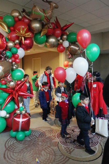 Children from Casa del Carmen Preschool in North Philadelphia walk through a festive balloon arch at the 2022 Archbishop’s Benefit for Children Christmas Party. (Photo: Sarah Webb)