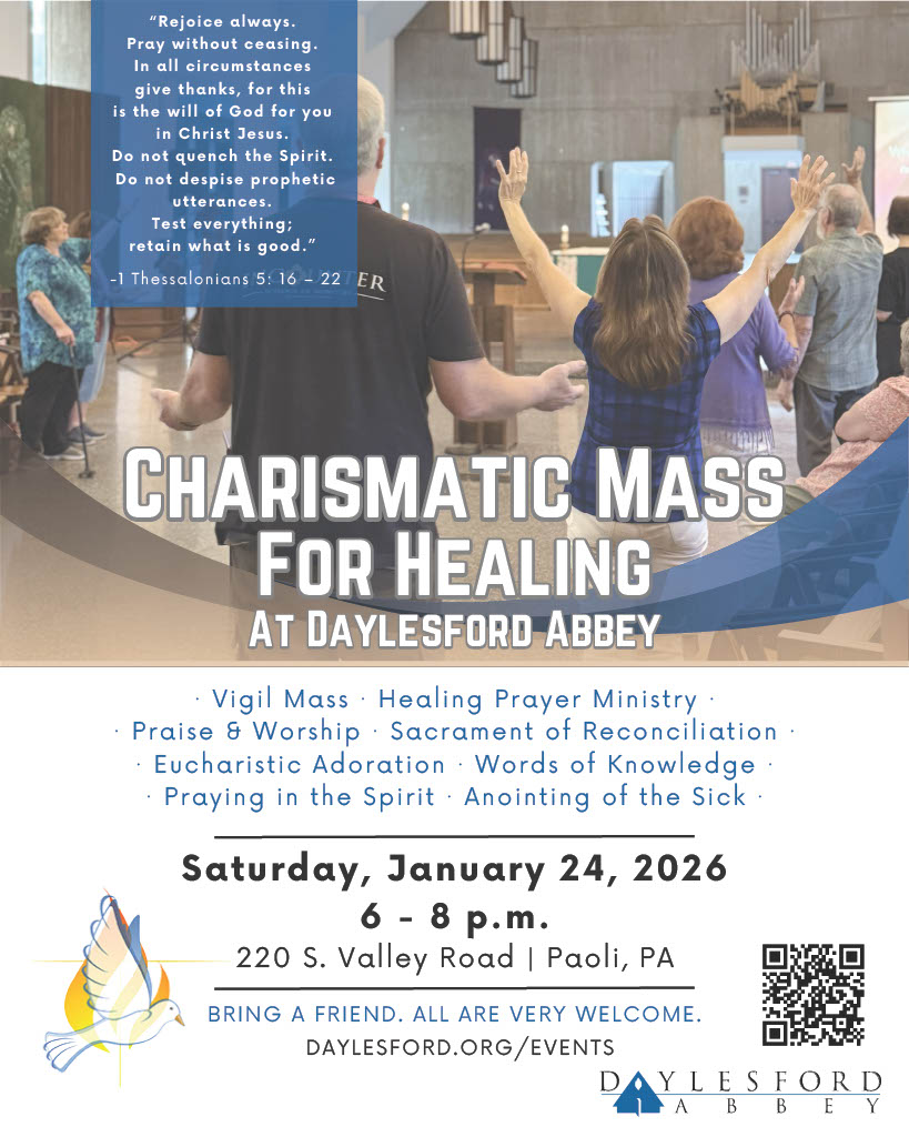 Daylesford Abbey in Paoli will host a Charismatic Mass for Healing on Jan. 24 at 6 p.m. The evening will include a vigil Mass, healing prayer ministry, the Sacrament of Reconciliation, Eucharistic adoration, words of knowledge, praying in the Spirit, and the anointing of the sick. The event is intended to offer participants multiple opportunities for worship and spiritual renewal. For more information, visit here.