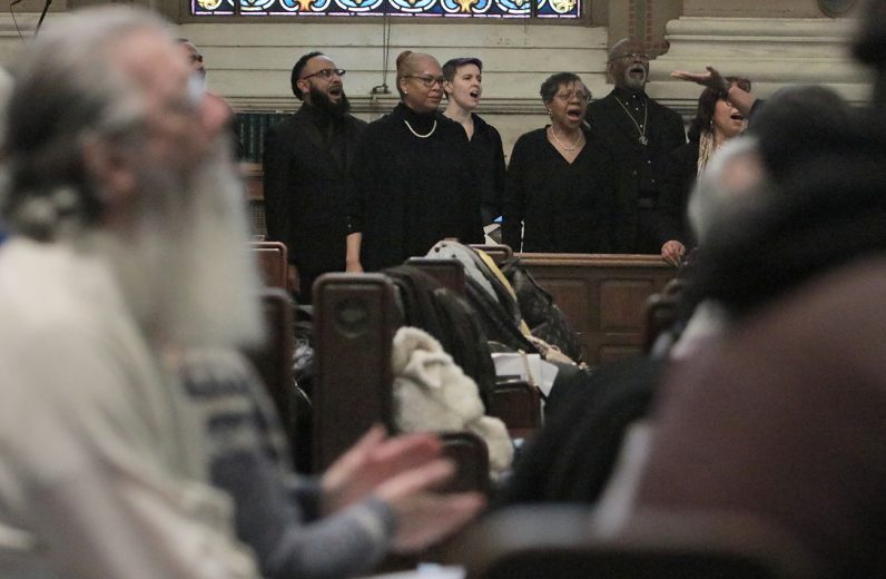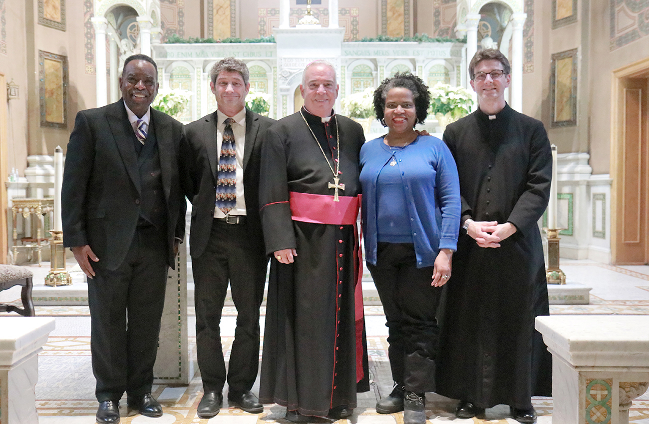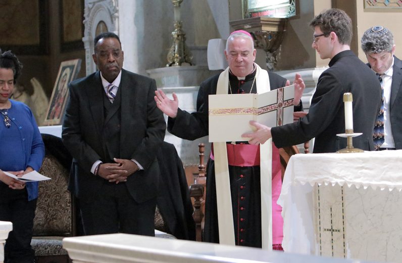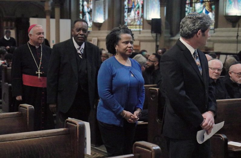 Dr. Tia Pratt of Villanova University, Rev. Owen Gowans of Mount Moriah Temple Baptist Church, Archbishop Nelson J. Pérez, Father Matthew Biedrzycki, and Rabbi Shai Cherry of Congregation Adath Jeshurun participate in the liturgy during the Dr. Martin Luther King Jr. Interfaith Prayer Service at St. Malachy Catholic Church.