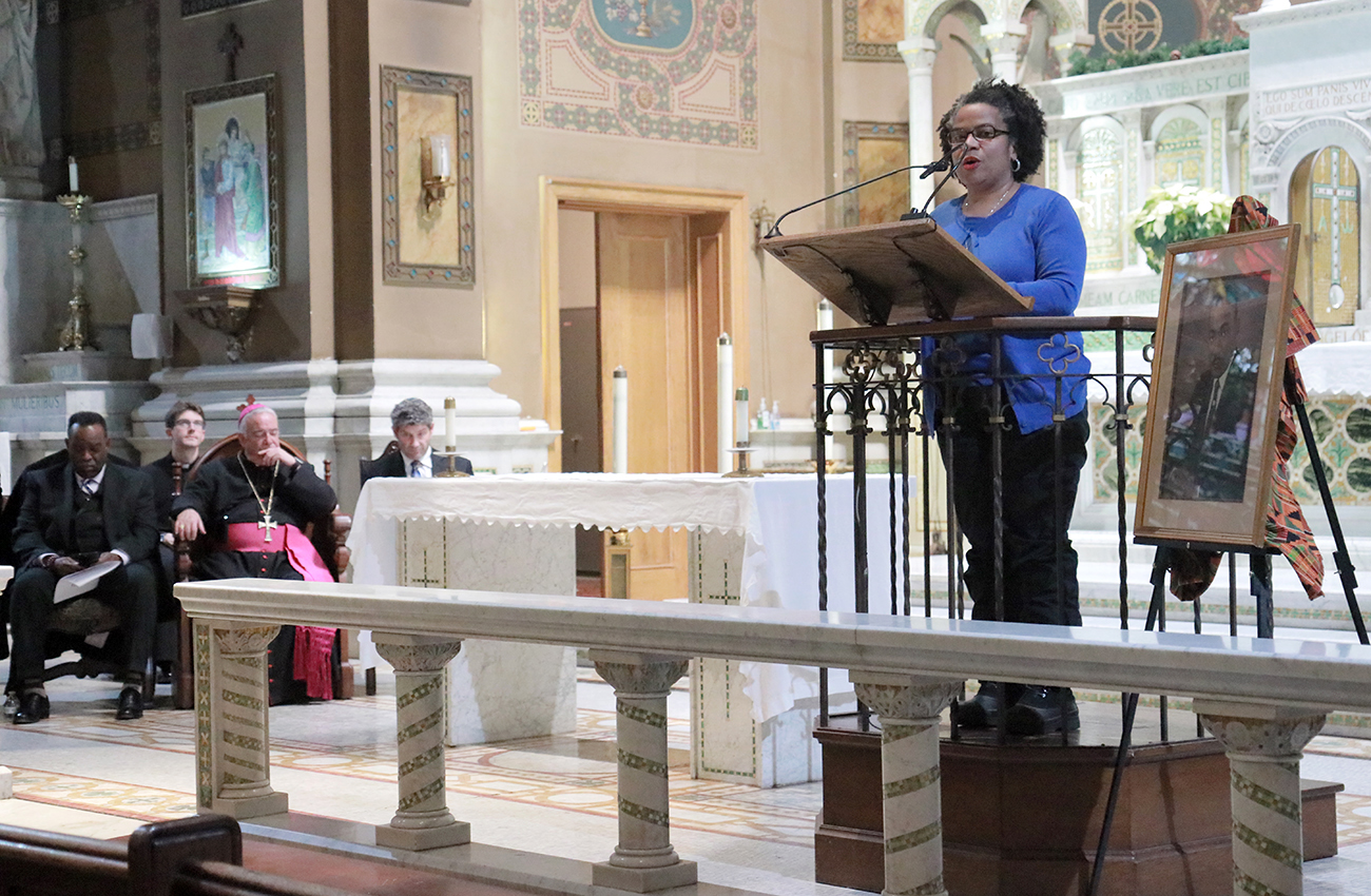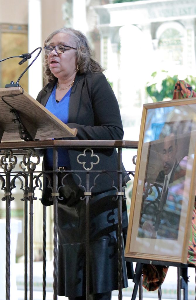 Stacy Williams, director of the Office for Black Catholics, speaks during the Dr. Martin Luther King Jr. Interfaith Prayer Service at St. Malachy Catholic Church.
