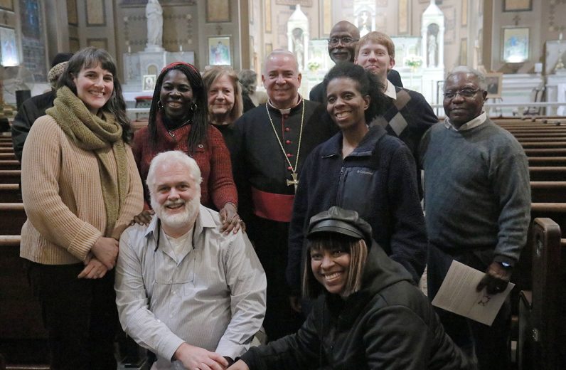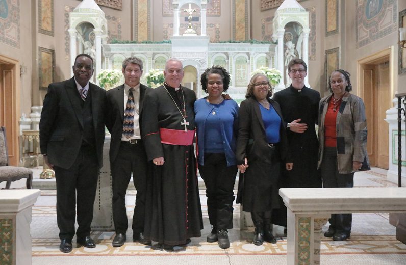 Rev. Owen Gowans of Mount Moriah Temple Baptist Church, Rabbi Shai Cherry of Congregation Adath Jeshurun, Archbishop Nelson J. Pérez, Dr. Tia Pratt of Villanova University, Stacy Williams and Dr. Antoinette Reaves of the Office for Black Catholics, and Father Matthew Biedrzycki, pastor of St. Malachy Parish, gather during the Dr. Martin Luther King Jr. Interfaith Prayer Service in North Philadelphia.
