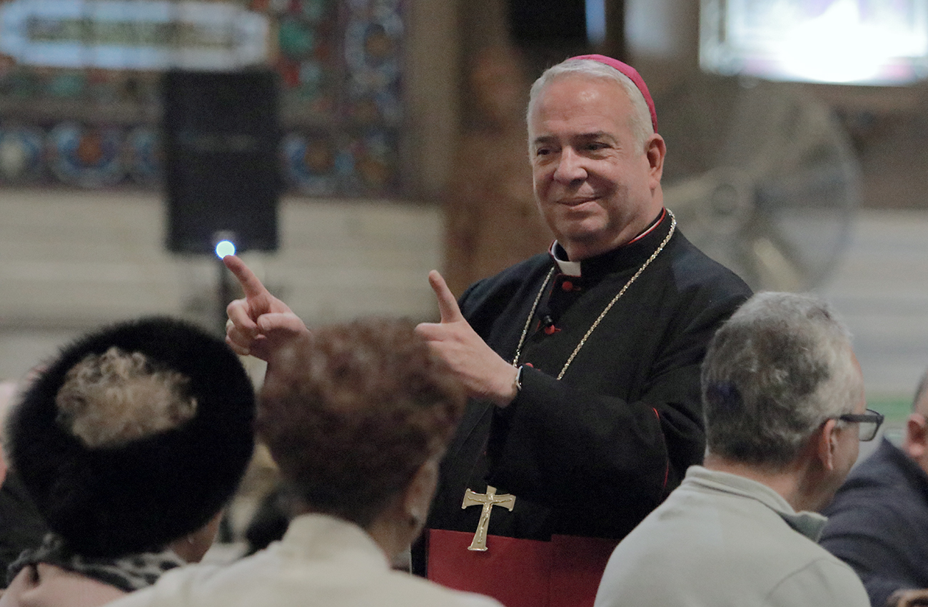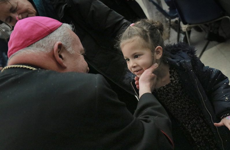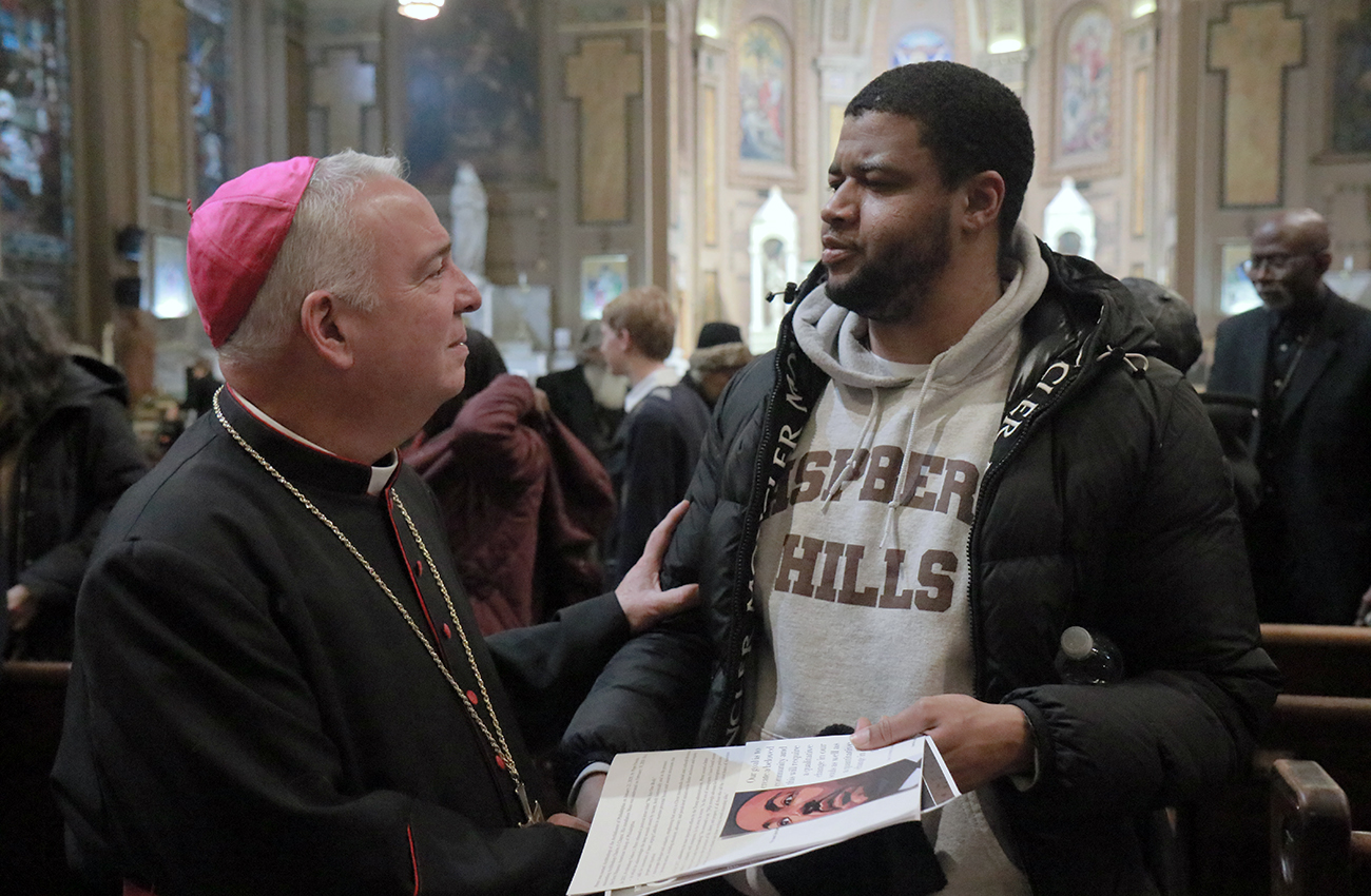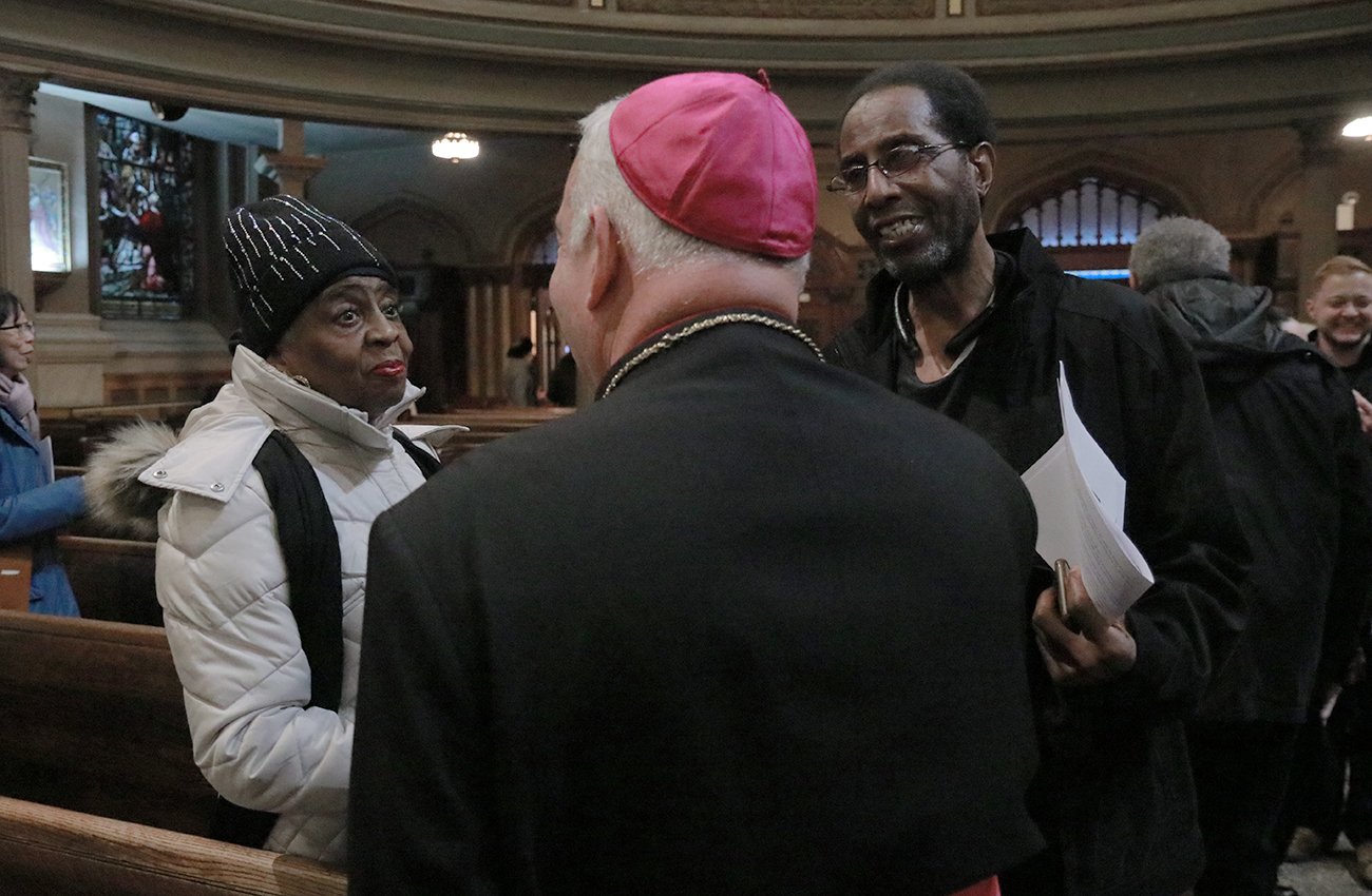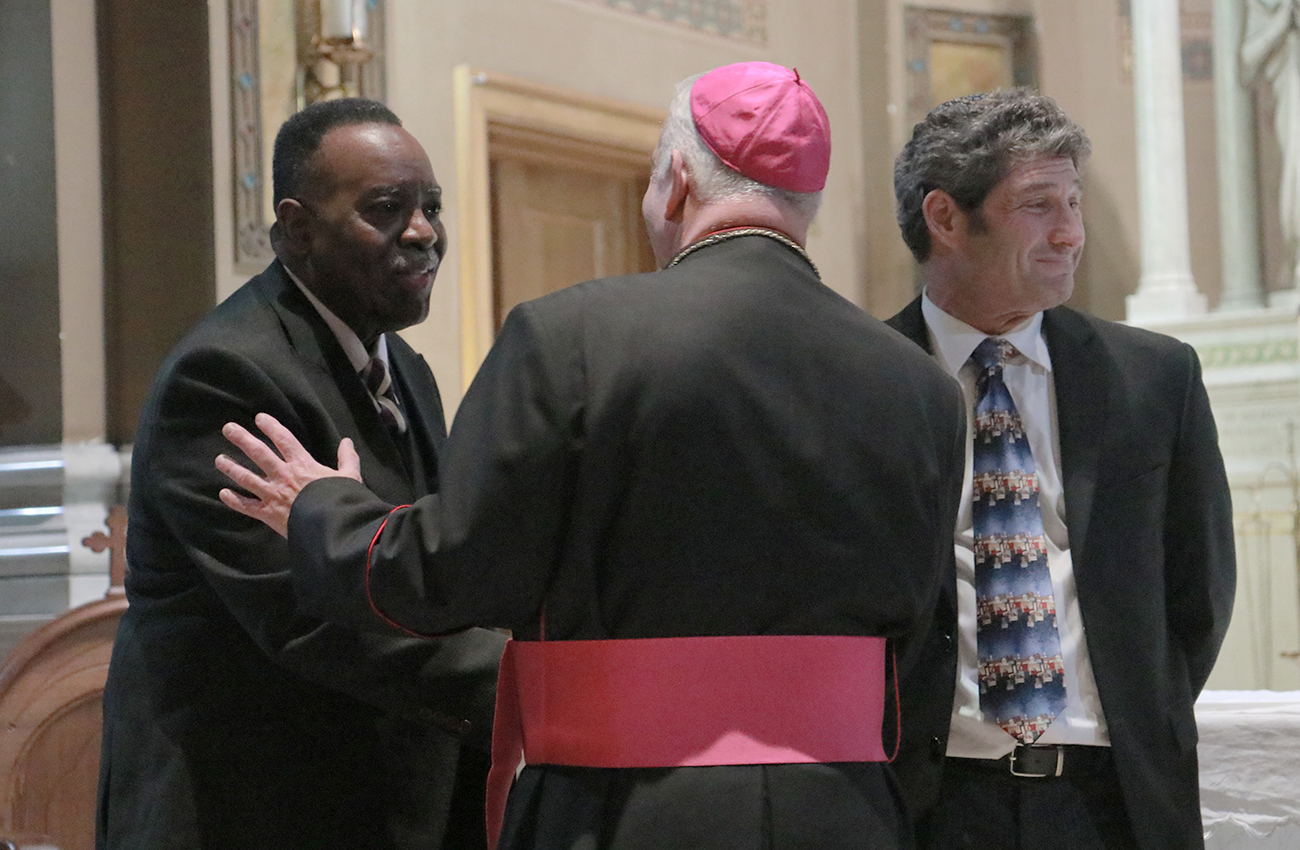 Rev. Owen Gowans, pastor of Mount Moriah Temple Baptist Church, Archbishop Nelson J. Pérez, and Rabbi Shai Cherry of Congregation Adath Jeshurun greet each other before the Dr. Martin Luther King Jr. Interfaith Prayer Service at St. Malachy Catholic Church.