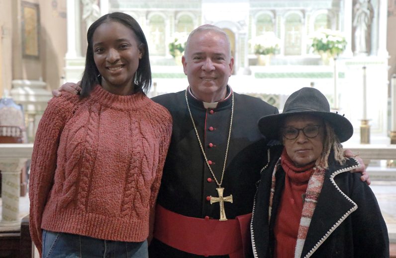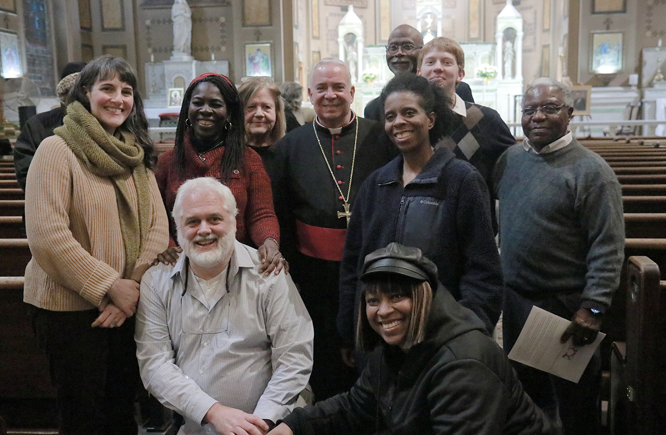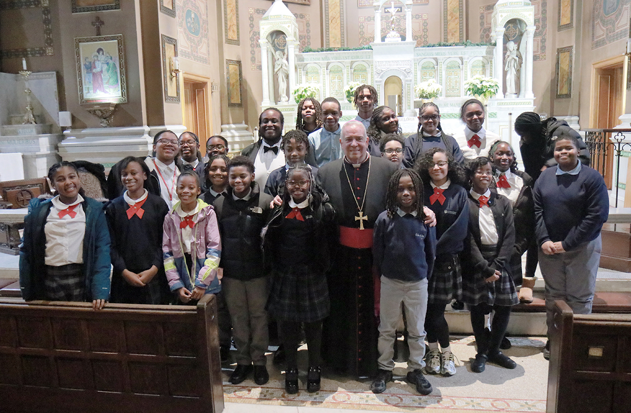 Members of the St. Rose of Lima School Choir, directed by Esau Jones, pose for a photo with Archbishop Nelson J. Pérez during the Dr. Martin Luther King Jr. Interfaith Prayer Service at St. Malachy Catholic Church.