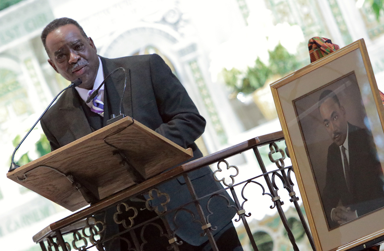 Rev. Owen Gowans, pastor of Mount Moriah Temple Baptist Church, speaks during the Dr. Martin Luther King Jr. Interfaith Prayer Service at St. Malachy Catholic Church.