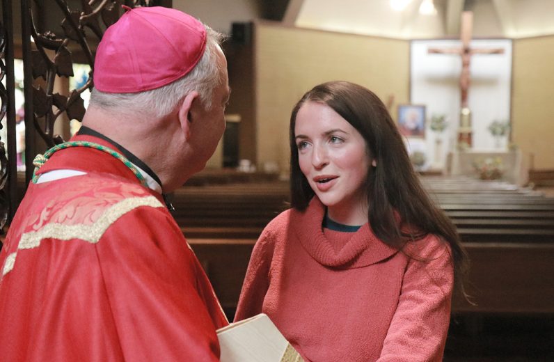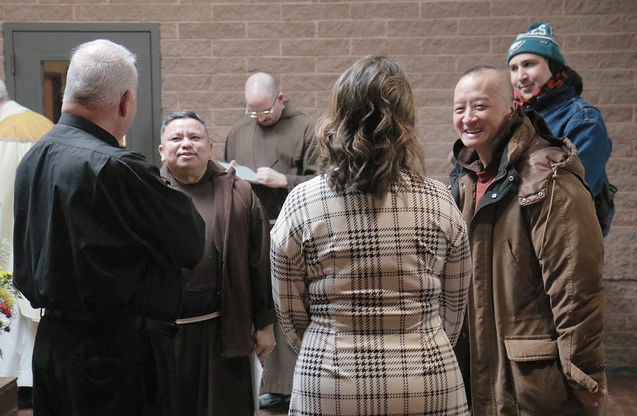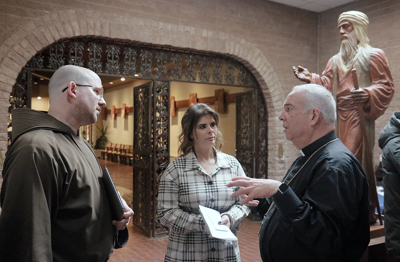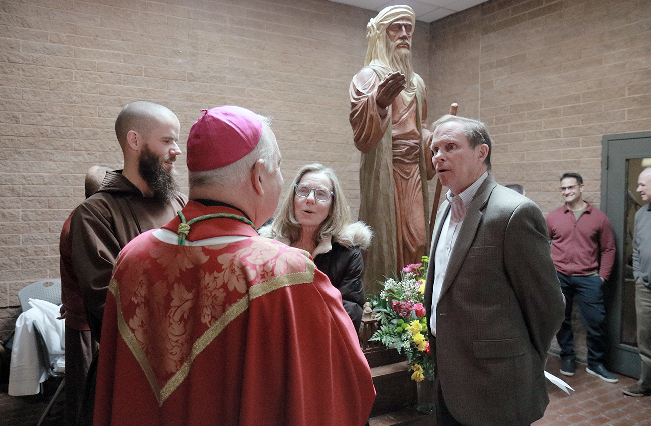 Archbishop Nelson J. Pérez greets staff members at the Cenacle at the Padre Pio Prayer Center during his Jan. 21 pastoral visit.