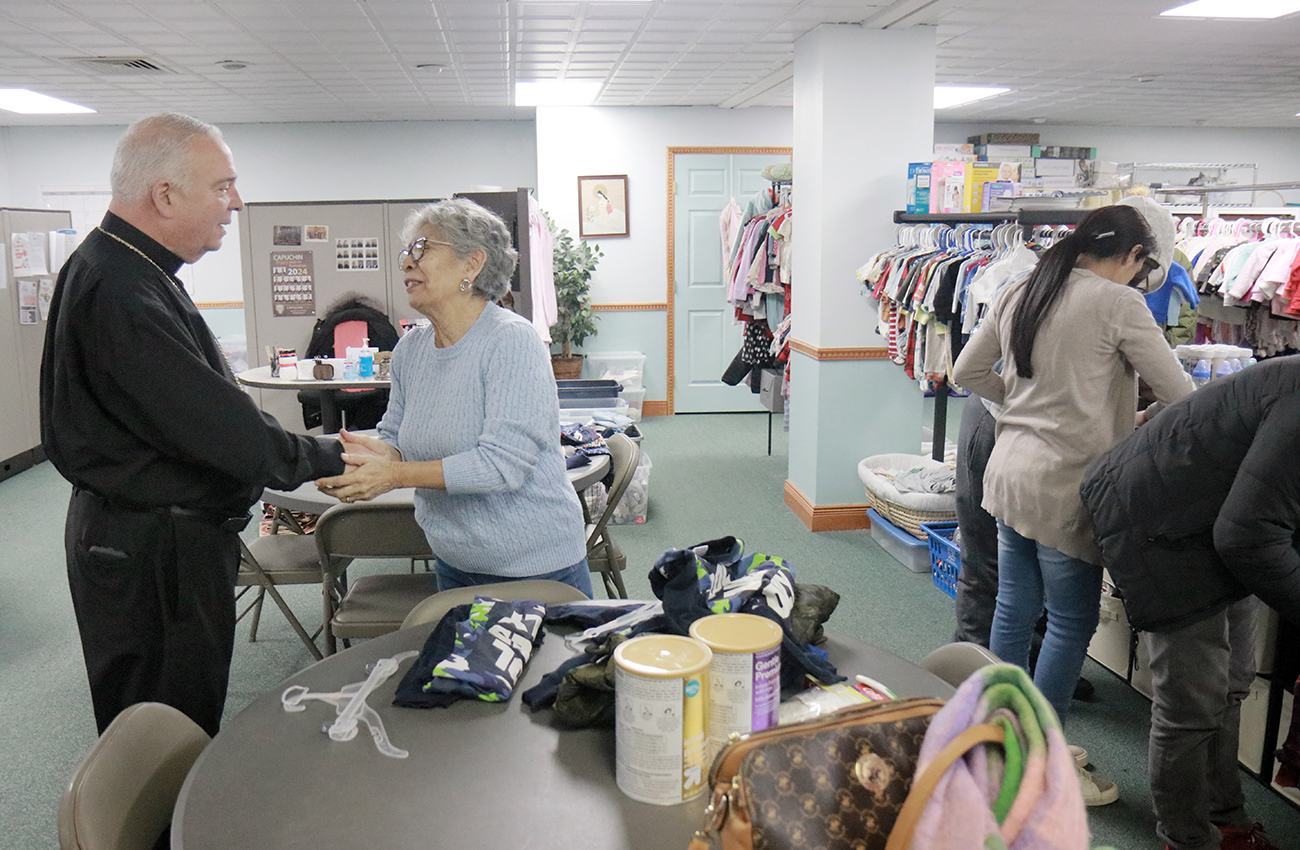 Archbishop Nelson J. Pérez greets a woman served by Annie’s Home during his Jan. 21 pastoral visit.