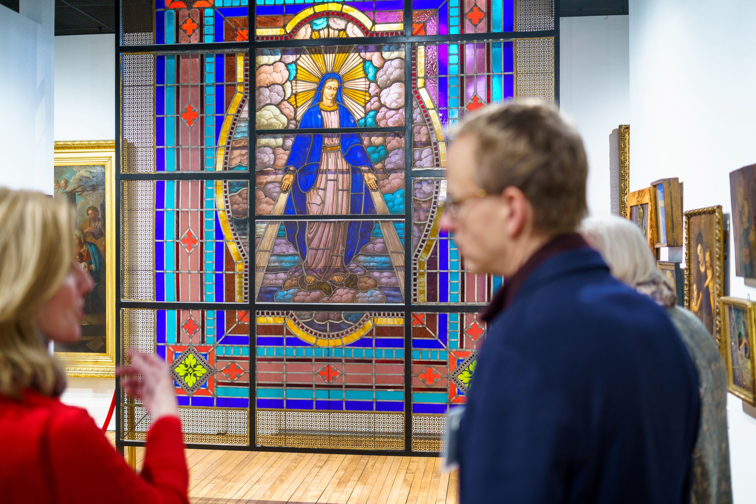 Visitors admire stained glass from the former John W. Hallahan High School, which was gifted to the Basilica Shrine of Our Lady of the Miraculous Medal when the school closed. (Photo: Central Association of the Miraculous Medal)