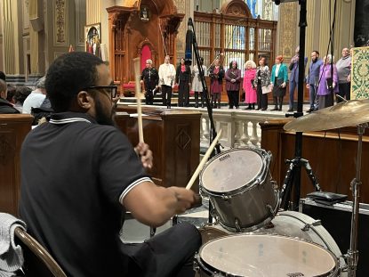 A percussionist supports the choirs during the “Lift Every Voice and Sing” interfaith concert at the Cathedral Basilica of SS. Peter and Paul on Feb. 8. (Photo by Jay Sorgi)