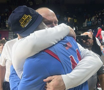 Father Judge senior Derrick Morton-Rivera and Coach Chris Roantree share an embrace after securing the Crusaders’ second-straight PCL championship Feb. 22. (Photo by John Knebels)