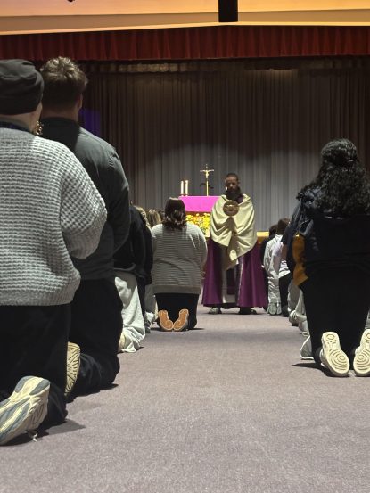 After the students participated in these prayerful activities for about two hours, the most unique experience took place. Students spread throughout the auditorium before Father Herlihey began to lead a procession with the monstrance through the room. Every student in the front rows was blessed with the opportunity to have Jesus in the Blessed Sacrament right in front of them.