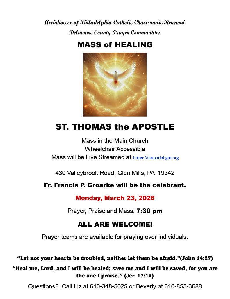 The Delaware County Prayer Communities of the Archdiocese of Philadelphia’s Catholic Charismatic Renewal will host a Mass of Healing on Monday, March 23 at St. Thomas the Apostle Church. Father Francis P. Groarke will celebrate the liturgy, beginning at 7:30 p.m. with prayer and praise.