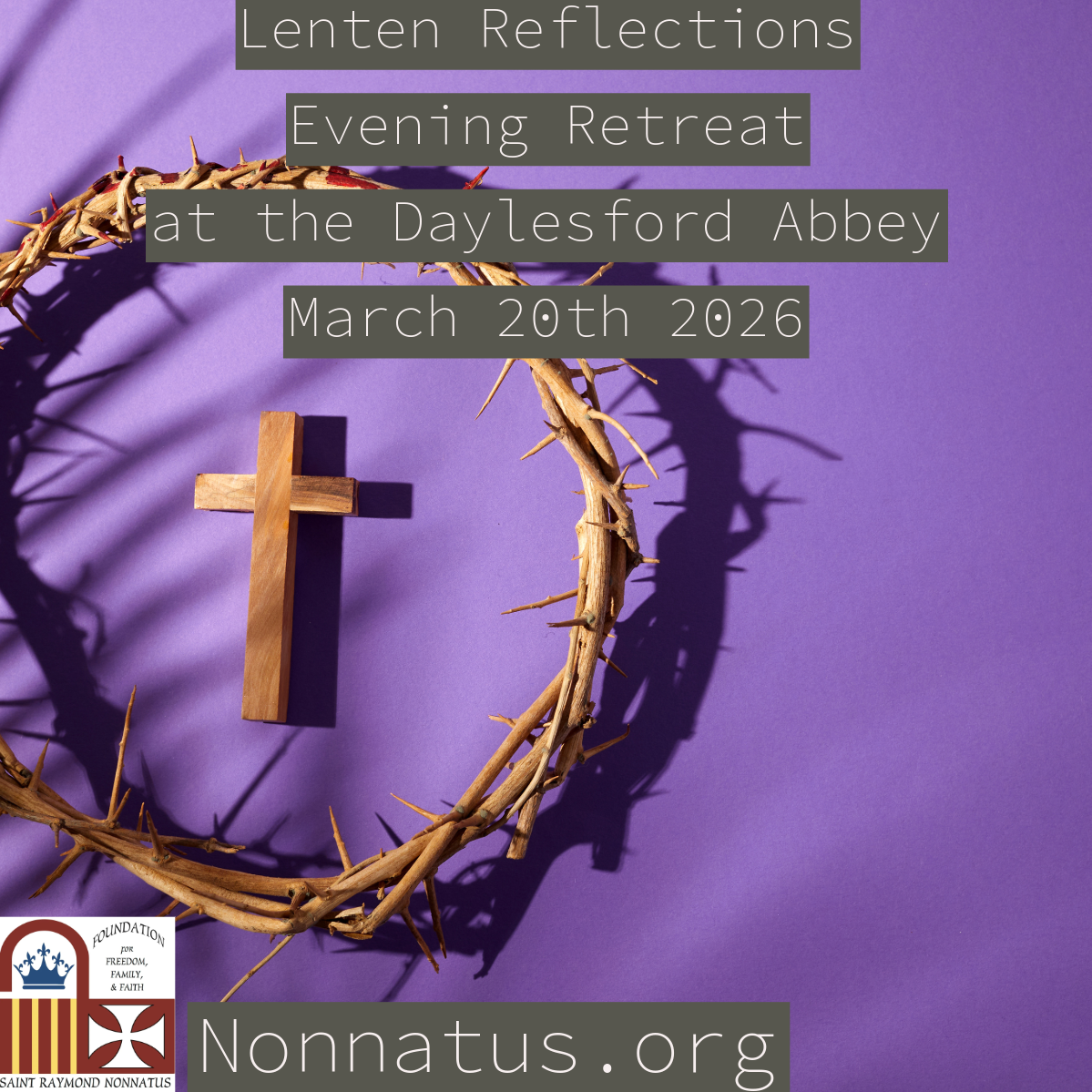 The St. Raymond Nonnatus Foundation will hold a Lenten Reflections Evening Retreat on March 20, from 4:00 p.m. to 8:00 p.m. at Daylesford Abbey in Paoli. The retreat invites participants to enter more deeply into the Lenten practices of prayer, fasting, and almsgiving.