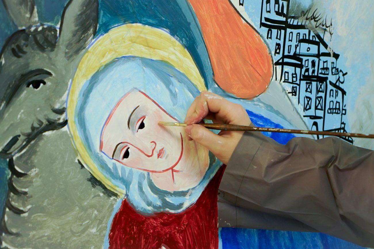 Drawing on traditions of murals, folk painting and devotional art, the work blends sacred Christian imagery tied to the liturgical calendar with contemporary symbols portraying collective memory, suffering and resilience.