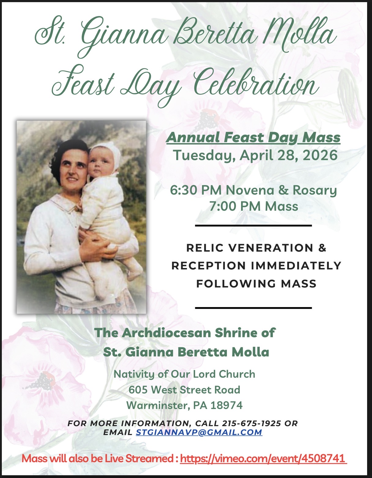Nativity of Our Lord Church in Warminster will mark the feast day of St. Gianna Beretta Molla on Monday, April 28, with a special evening of prayer and celebration at the Archdiocesan Shrine dedicated in her honor.