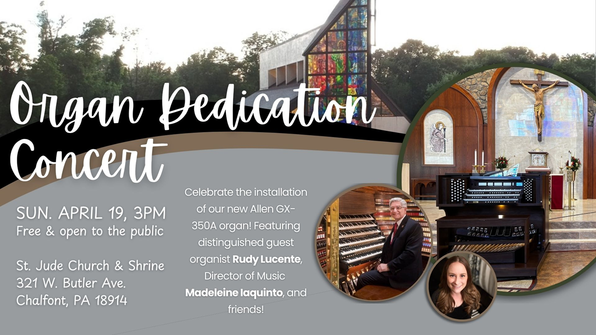 An Organ Dedication Concert will take place from 3:00 to 4:00 p.m. Sunday, April 19, at St. Jude Church and Shrine, 321 W. Butler Ave., Chalfont, celebrating the installation of the parish’s new Allen GX‑350A organ.