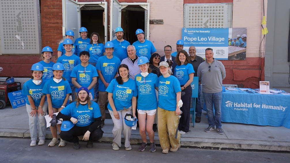 Villanova University students joined Habitat for Humanity Philadelphia on April 18 to launch Pope Leo Village, a multiyear affordable housing initiative in North Philadelphia, during a volunteer build day in Philadelphia’s Brewerytown section.