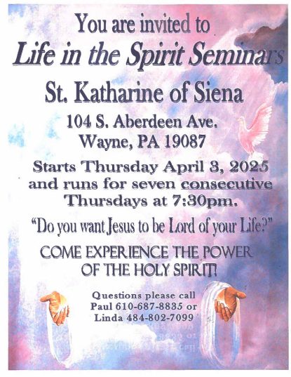 Join St. Katharine of Siena Parish on Thursday, April 3, and for seven consecutive Thursdays, for their “Life in the Spirit” Seminars starting at 7:30 p.m.