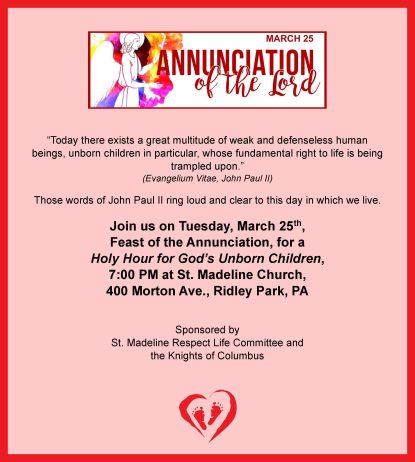 Join and gather at St. Madeline Church on the Feast of the Annunciation to pray for and honor God’s unborn children.