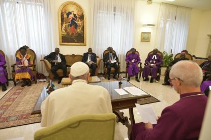 At retreat for South Sudan leaders, pope literally begs for peace