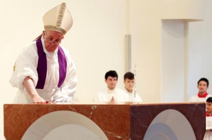 Pope Francis met with young people, newlyweds, volunteers, the sick, the elderly and other members of the parish of St. Julius in Rome before celebrating Mass in their newly restructured church, blessing and anointing the new altar.